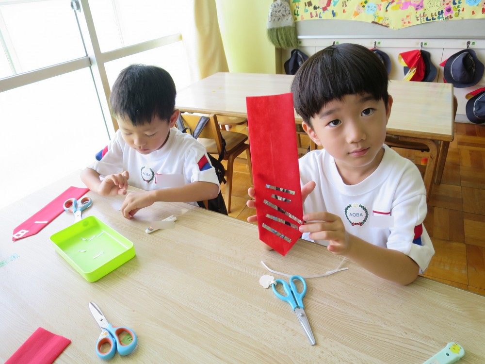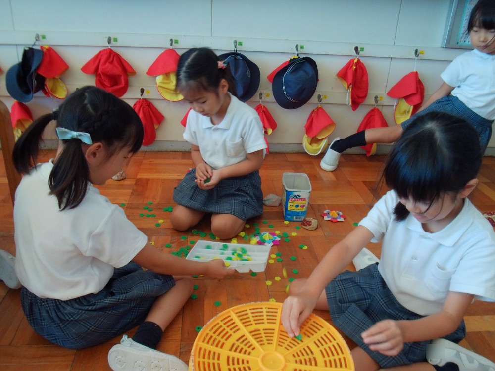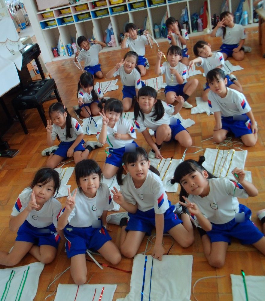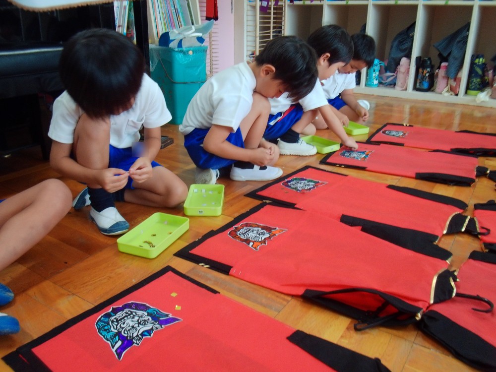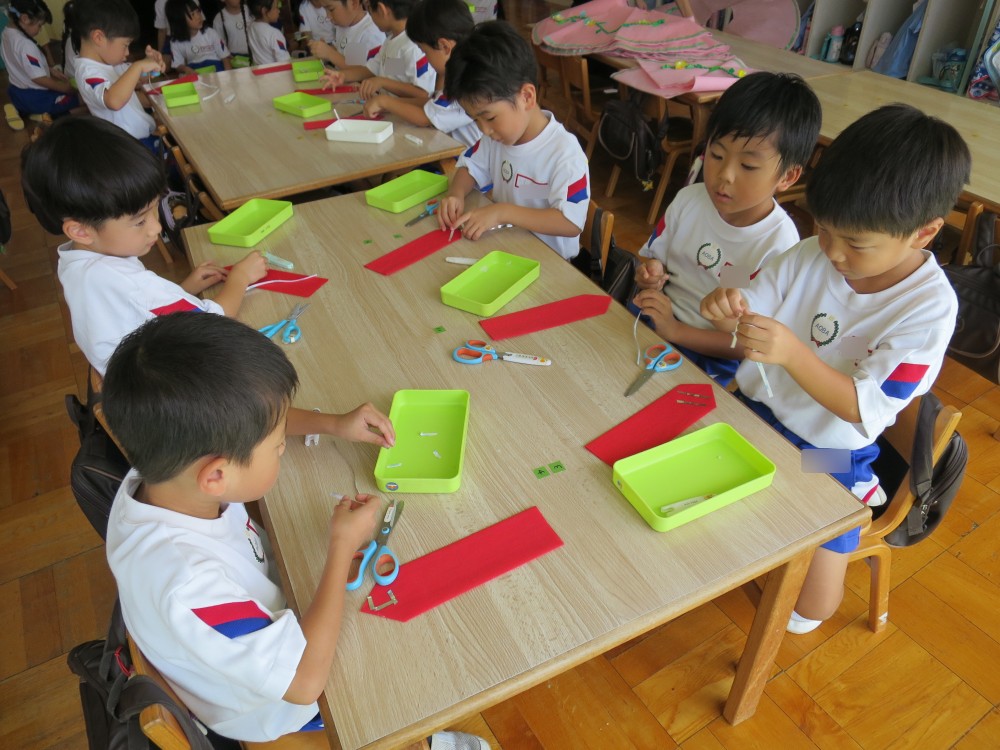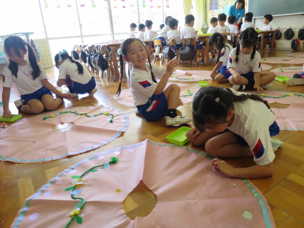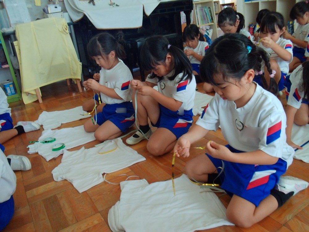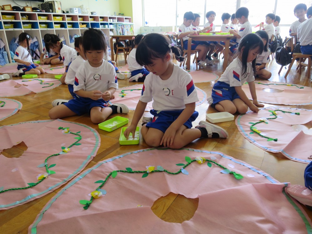 幼稚園最後の遊戯会。思い出深いものになるよう、自分たちで着る衣裳に飾りをつけをしました