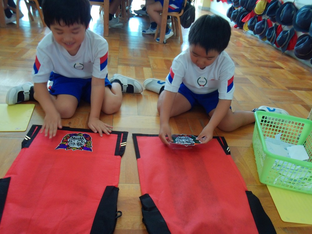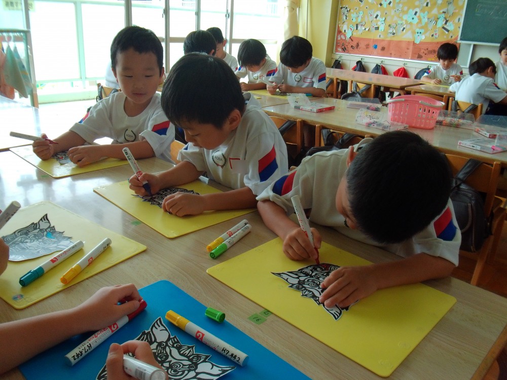 男の子の曲は琉球調 シーサーに色を付けて法被に貼ります。