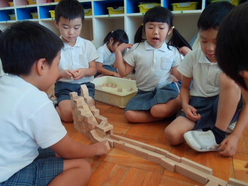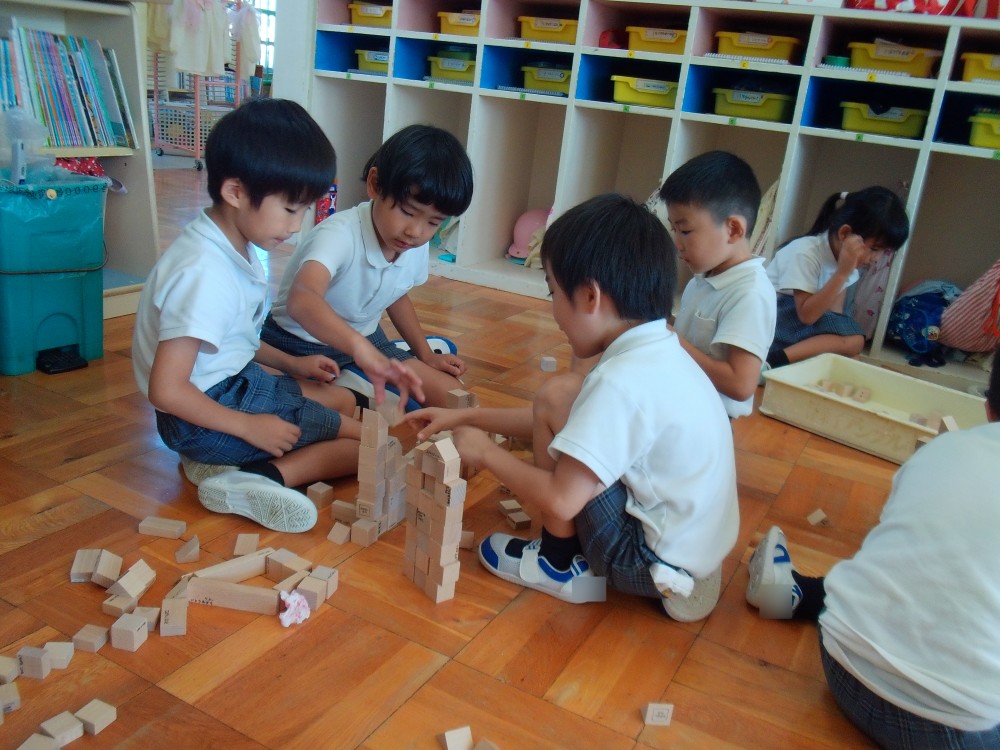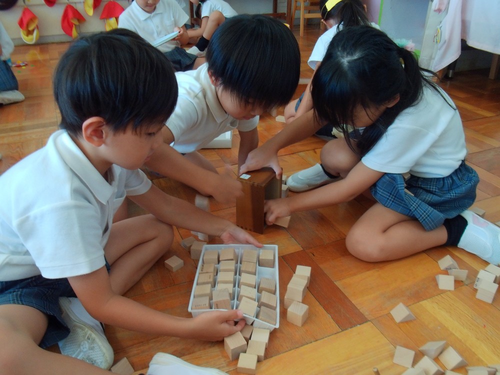 室内遊びでは、友達と一緒に積み木やおはじきで遊んでいます。