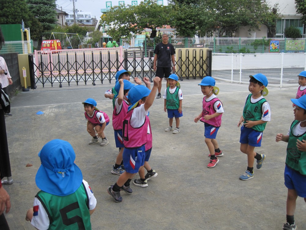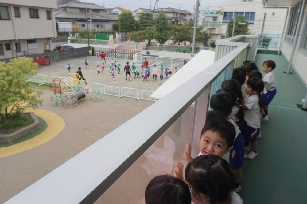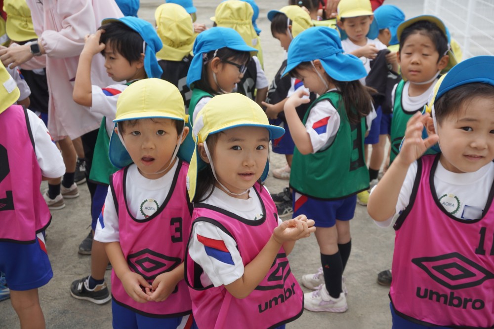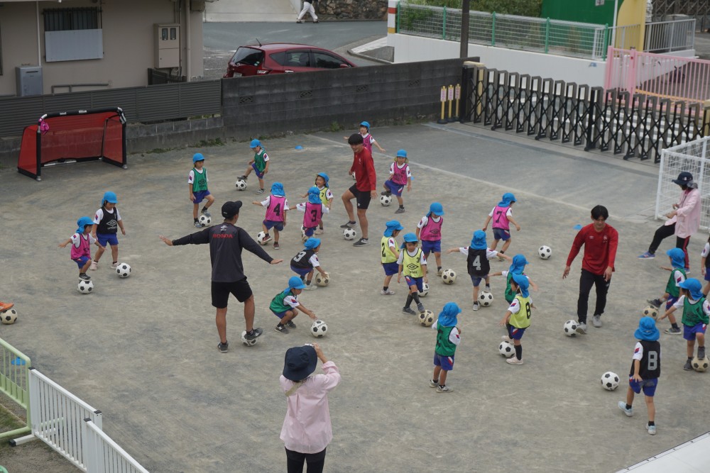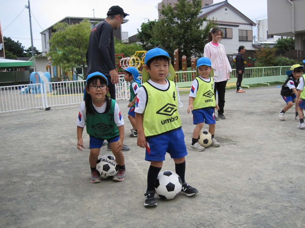 「ぼくたちもやりたいなぁ」年少組さんもサッカー教室の様子をずっと見ていました。