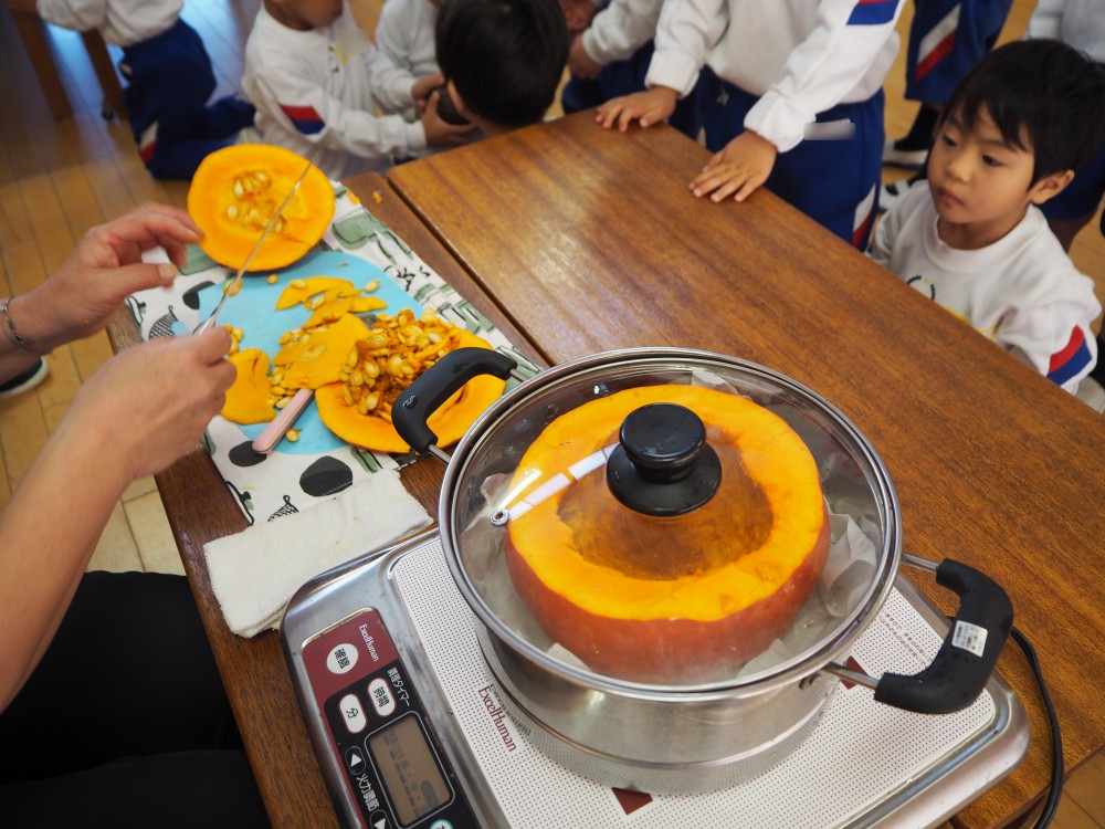 かぼちゃが蒸しあがり試食タイム
