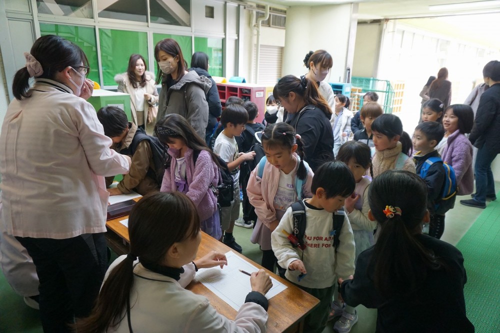 受付は自分で名前と小学校を書きます。漢字も使ってきれいに書けているね。