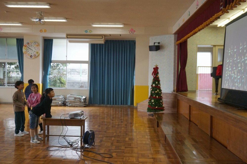 幼稚園での思い出スライド鑑賞中。