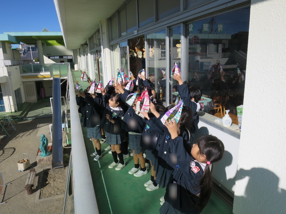 みんなで空に向かって「今日はクリスマス会ですよ」とサンタさんに声をかけました。