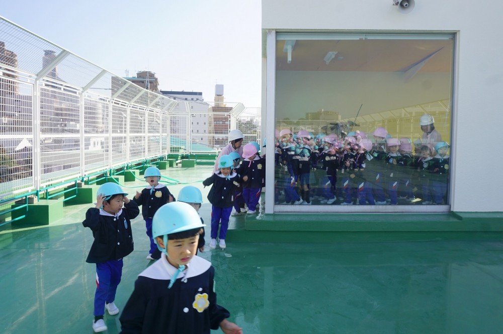 地震で津波が来ることを想定し、屋上に避難する訓練です